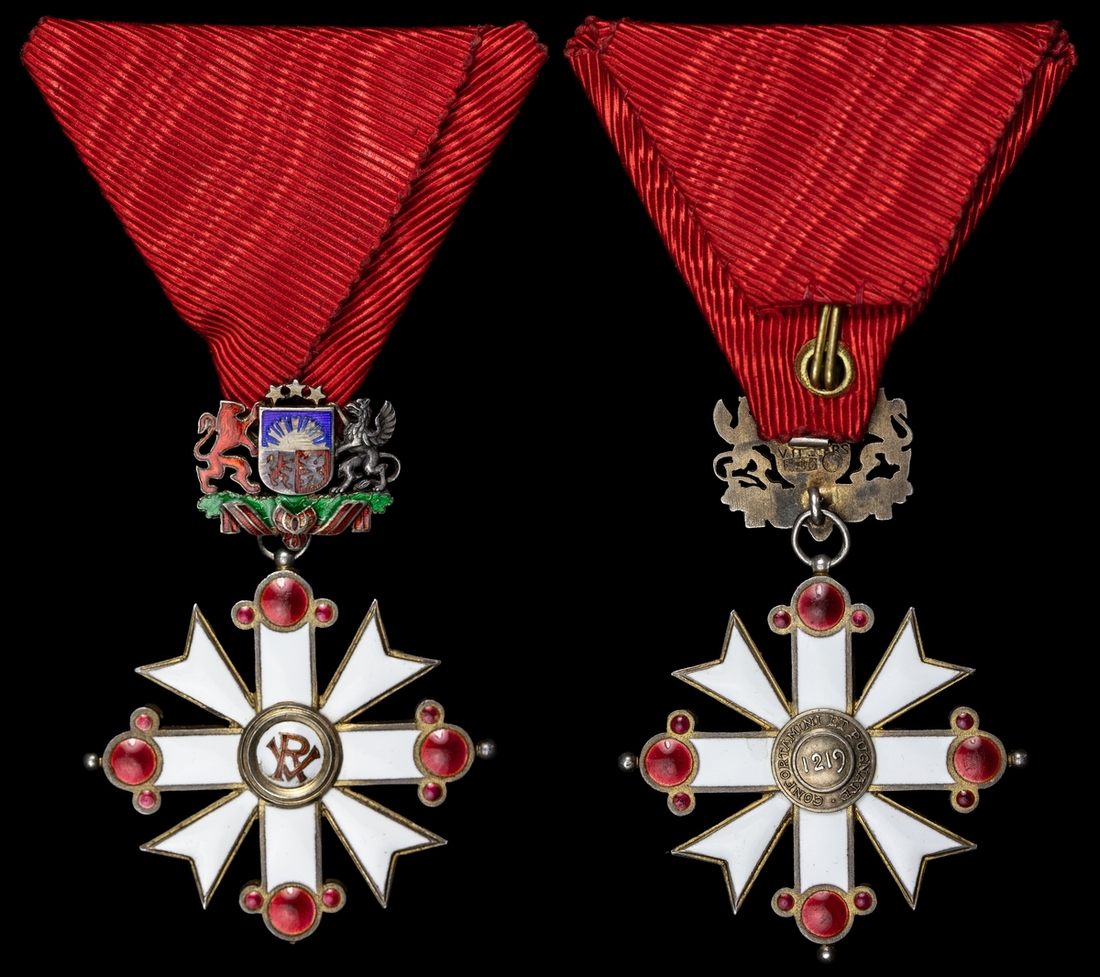 (x) Latvia, Republic, Order of Viesturs, Civil Division, 5th Class Knight's breast Badge, 62mm including coat of arms suspension x 43mm, silver and enamel, by V. Millers, Riga, hallmarks and maker's mark to reverse of coat of arms suspension, enamel cracks on one reverse arm, otherwise good very fine, scarce