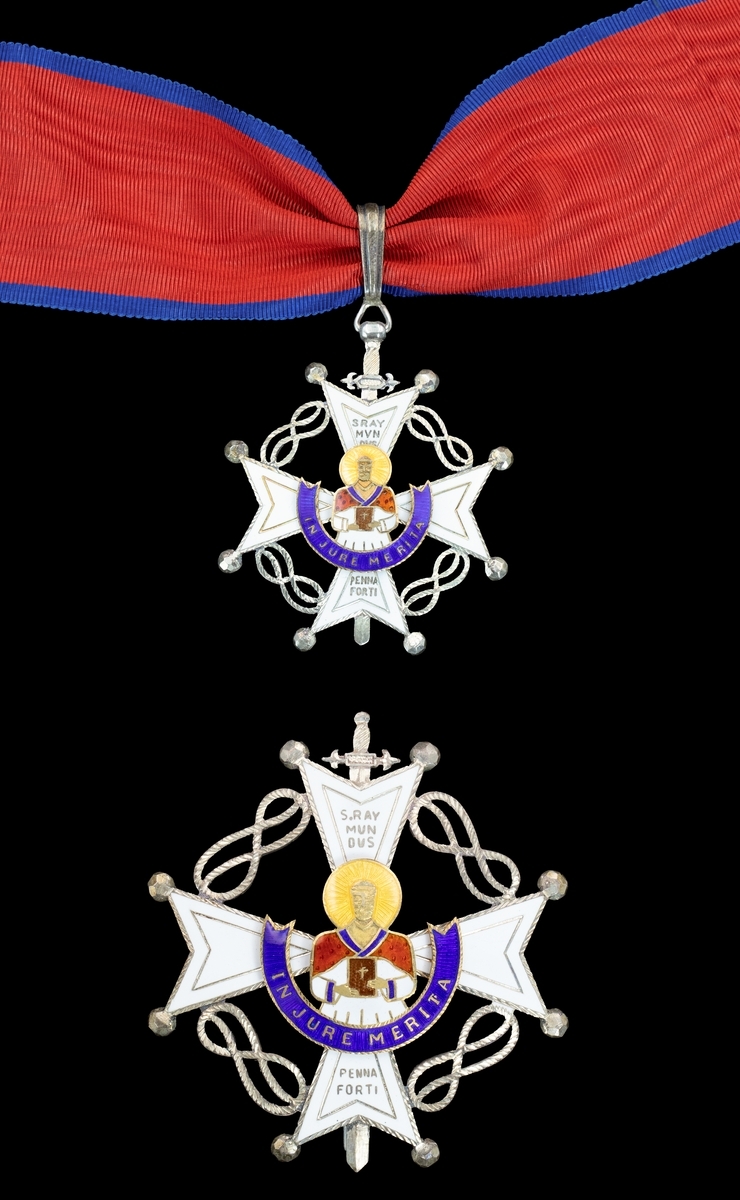 (x) Spain, Kingdom, Order of Saint Raymond of Penafort, Second Class set of Insignia, comprising neck Badge 57mm x 50mm; breast Star 75mm x 6.8cm, gilt, silver-silver and enamel, in Cejalvo, Madrid case of issue extremely fine