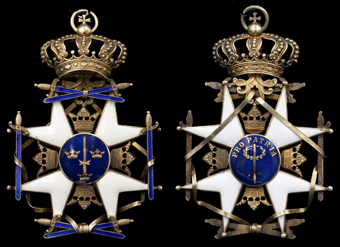(x) Sweden, Kingdom, Order of the Sword, Badge, 80mm including crown suspension x 54mm, silver-gilt, gold centres and enamel, a little enamel chipping, very fine