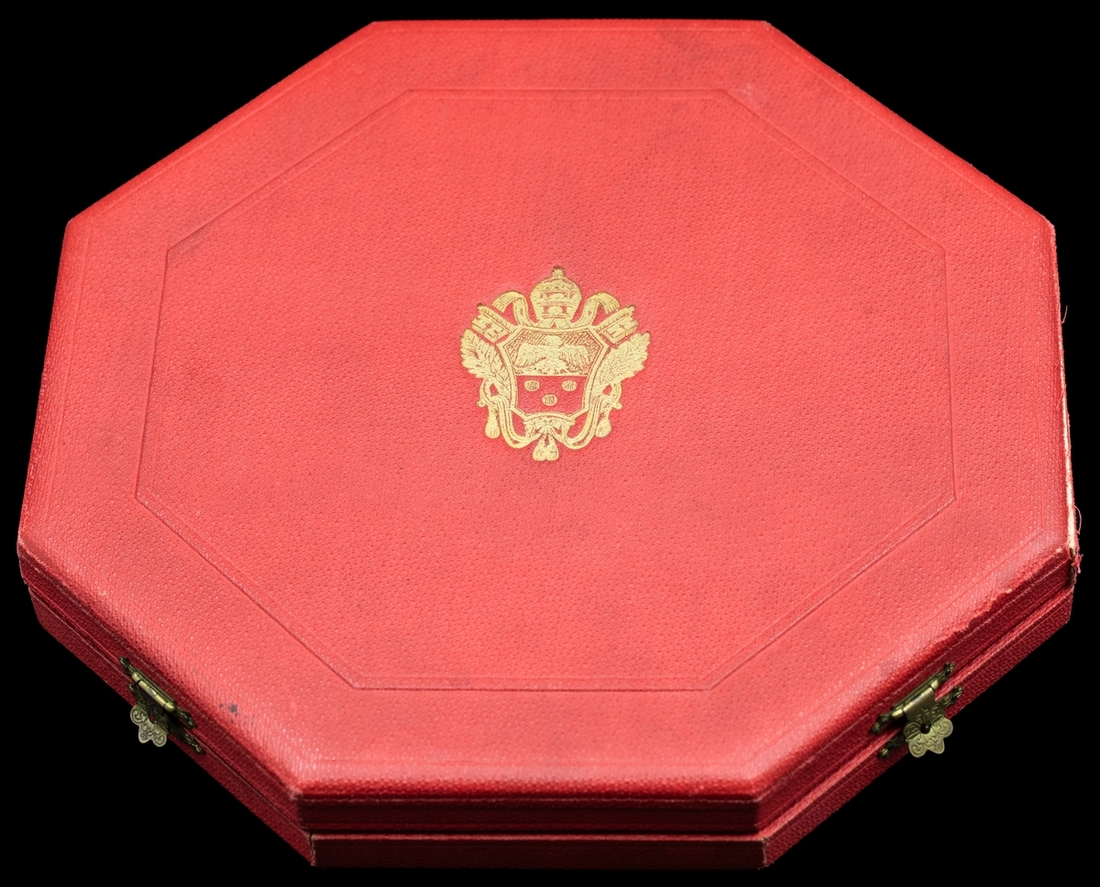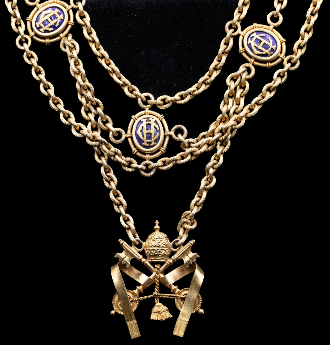 Vatican, Holy See, Honorary Chamberlain´s Collar Chain, by Tanfani & Bertarelli, comprising ten medallions inscribed ´CH´, connected by triple-linked chain, gilt and enamel, two of the medallions with reverse affixing hooks, with Badge Appendant, 63mm including Papal tiara suspension x 78mm, gilt, good very fine and rare, in its original slightly damaged fitted case of issue, this with the lid blocked with coat of arms of Pope Pius XI (1922-39)