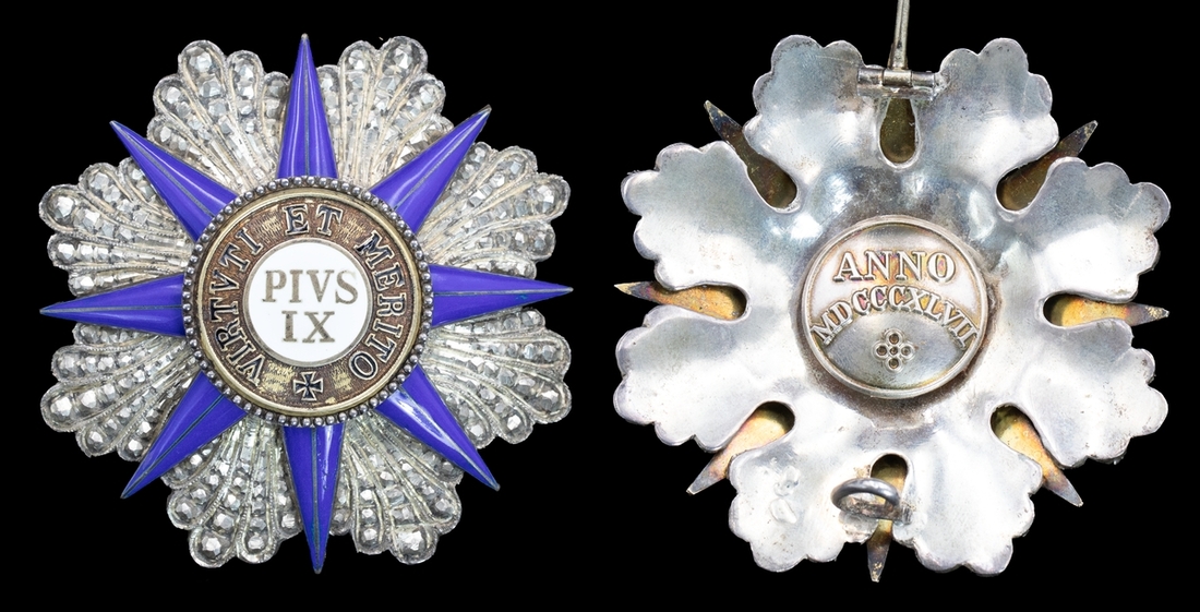 (x) Vatican, Order of Pius IX (Ordo Pio IX), Grand Cross set of Insignia, comprising sash Badge, 67mm, silver-gilt and enamel; Star, 75mm, silver, silver-gilt, and enamel, good very fine, with full sash riband (2)