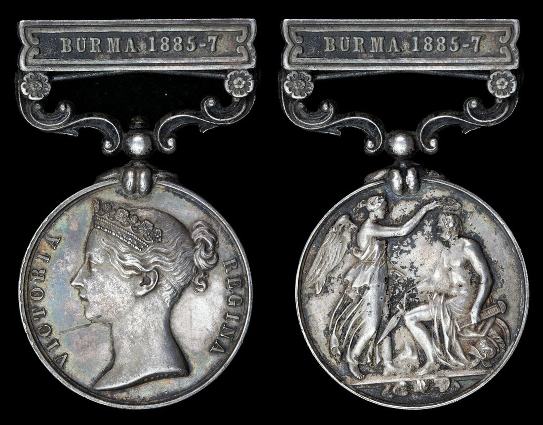 William Roberts enlisted with the Royal Wesh Fusiliers on 19 May 1884 and embarked for India on 15 December 1885. He saw service in the Third Burma War, where the Regiment formed part of the 3rd Infantry Brigade, launching a seaborne invasion of Mandalay via the River Irrawaddy. The invasion was a success with limited resistance however the Battalion was needed in the country for some time afterwards, suppressing continuous armed resistance. Roberts is listed as dead upon the roll with his medal issued to Mary Roberts of Ty Capel, Denbigh. Notably a newspaper article in the Wrexham Advertiser in September 1891 requests applications 'from persons supposing themselves entitled as next of kin…'. This article lists a Private William Roberts, 1st R.W.F. although it should be noted two men of the same name are listed as deceased upon the same medal roll; sold together with copied research.