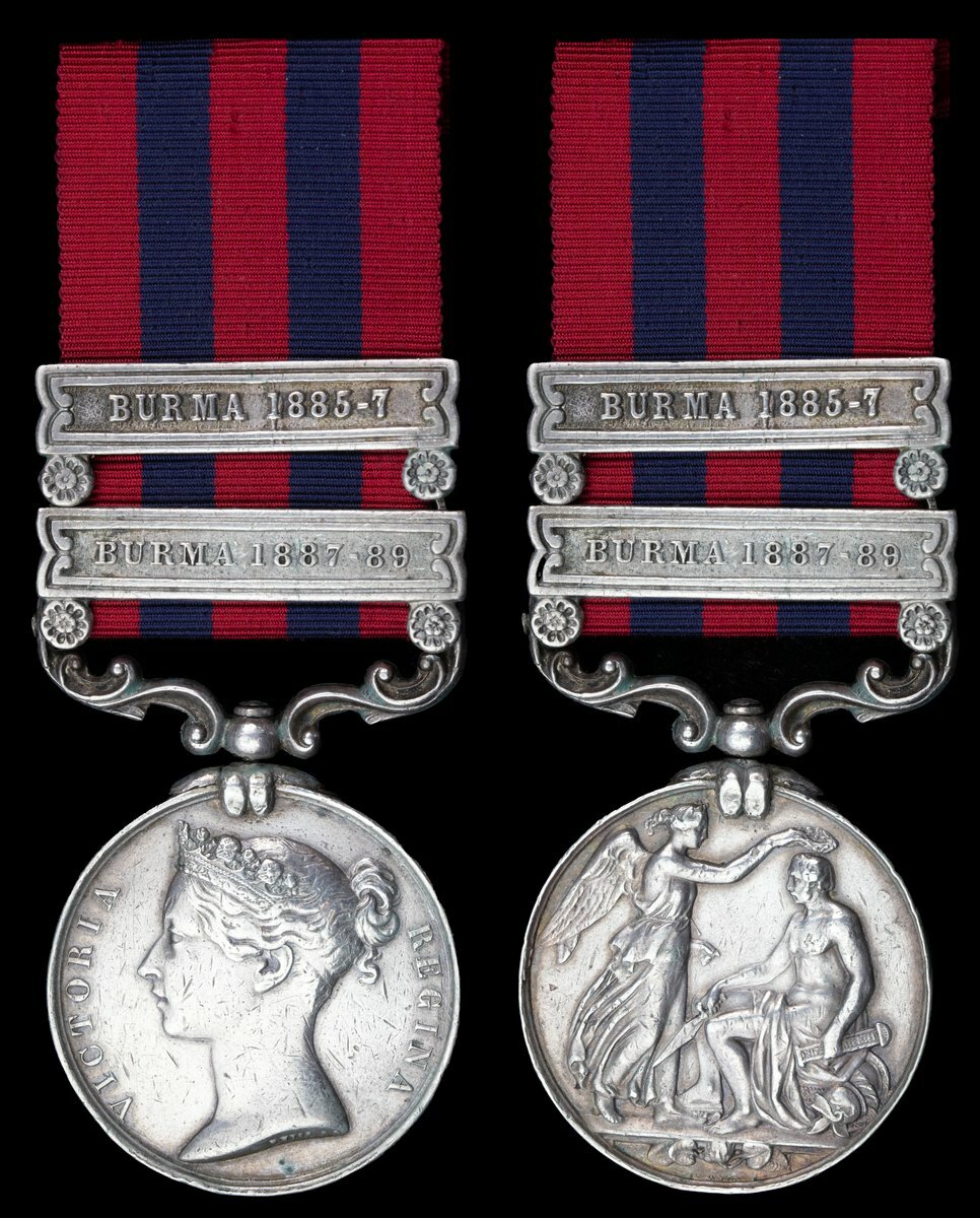 India General Service 1854-95, 2 clasps, Burma 1887-89, Burma 1885-7 (1423 Pte. E. H. Fealey. 1st Bn.... York L.I.), edge wear, very fine