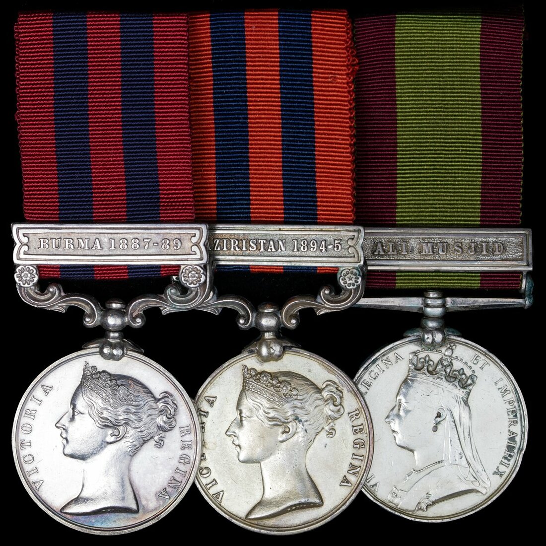(x) Afghanistan 1878-80, 1 clasp, Ali Musjid (8. Bde/184 Pte H. Thomas. 51st Regt); India General Service 1854-95, 1 clasp, Burma 1887-89 (437 Pte W Crook 2d Bn Ches. R.); India General Service 1854-95, 1 clasp, Waziristan 1894-5 (4562 Sepoy Yar Din 20th Bl Infy), suspension slightly loose on latter two medals, otherwise very fine (3)