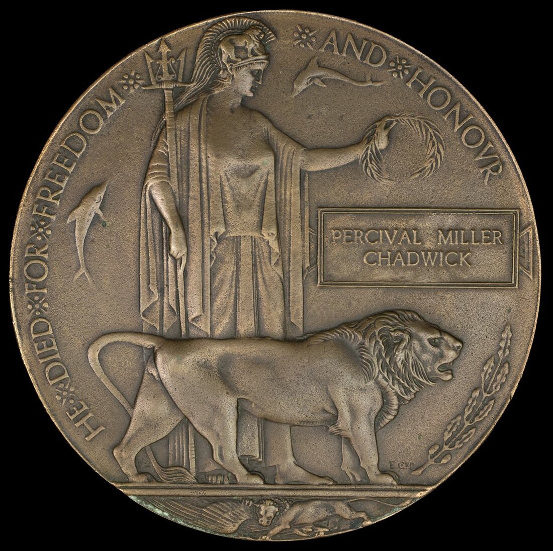 The Great War Bronze Memorial Plaque awarded to Lieutenant P. M. Chadwick, East Anglian Divisional Engineers, Royal Engineers, who was killed in action on 22 September 1918, a skilled engineer and recipient of the James Forrest Medal, Miller Prize and Birmingham Society of Engineers Silver Medal, who was further presented with the Freedom of the City of London before his death