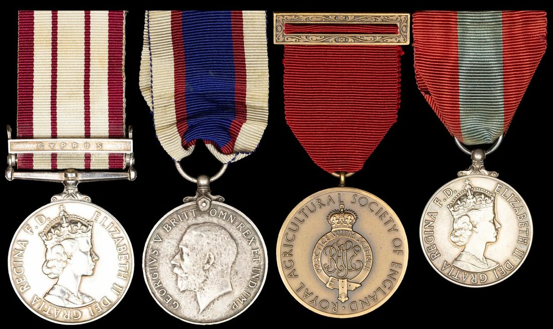 Naval General Service 1915-62, 1 clasp, Cyprus (D/SKX870523 J. D. Ansell. P.O.M. (E). R.N.) a later claim, very fine; Royal Fleet Reserve L.S. & G.C., G.V.R. (CH. 20925 (CH. B.3175) J. Bell. Mne. R.F.R.), contact marks good fine; Imperial Service Medal, E.II.R. (Miss Margaret Elizabeth Doulton), in case of issue, extremely fine; Royal Agricultural Society of England Long Service Medal (Ernest Charles Newton 56 Years Service 1955), in case of issue, extremely fine (4)