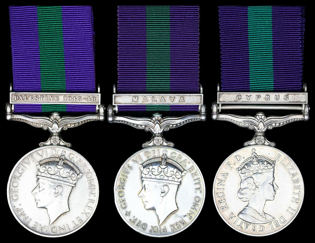 General Service 1918-62, 1 clasp, Palestine 1945-48 (14437090 Pte. M. Hamawi. Gordons.); General Service 1918-62, 1 clasp, Malaya (19047130 Bdr. H. H. Russell. RA.); General Service 1918-62, 1 clasp, Cyprus (22905957 Pte. P. W. Neville. R. Berks.), small edge bruise to the last otherwise very fine (3)