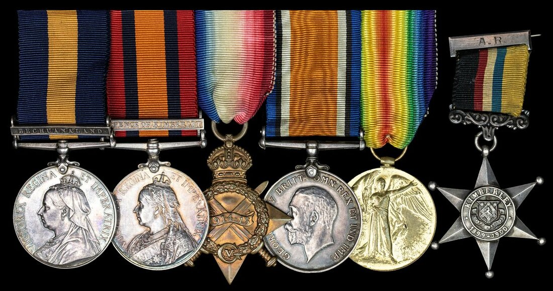 Cape of Good Hope General Service 1880-97, 1 clasp, Bechuanaland (Pte A. Rae. Kimby Rifs); Queen's South Africa 1899-1902, 1 clasp, Defence of Kimberley (137 Corpl: A. Rae. Kimberley Vol: Regt); Kimberley Star, hallmarked 'a', (137 Corpl. A. Rae Kimberley Regt) engraved to reverse, with riband bar (A. R.) engraved; 1914-15 Star (Pte A. Rae Veteran Rgt.); British War and South African Victory Medal (Pte. A. Rae. Veteran Rgt.), good very fine throughout (6)