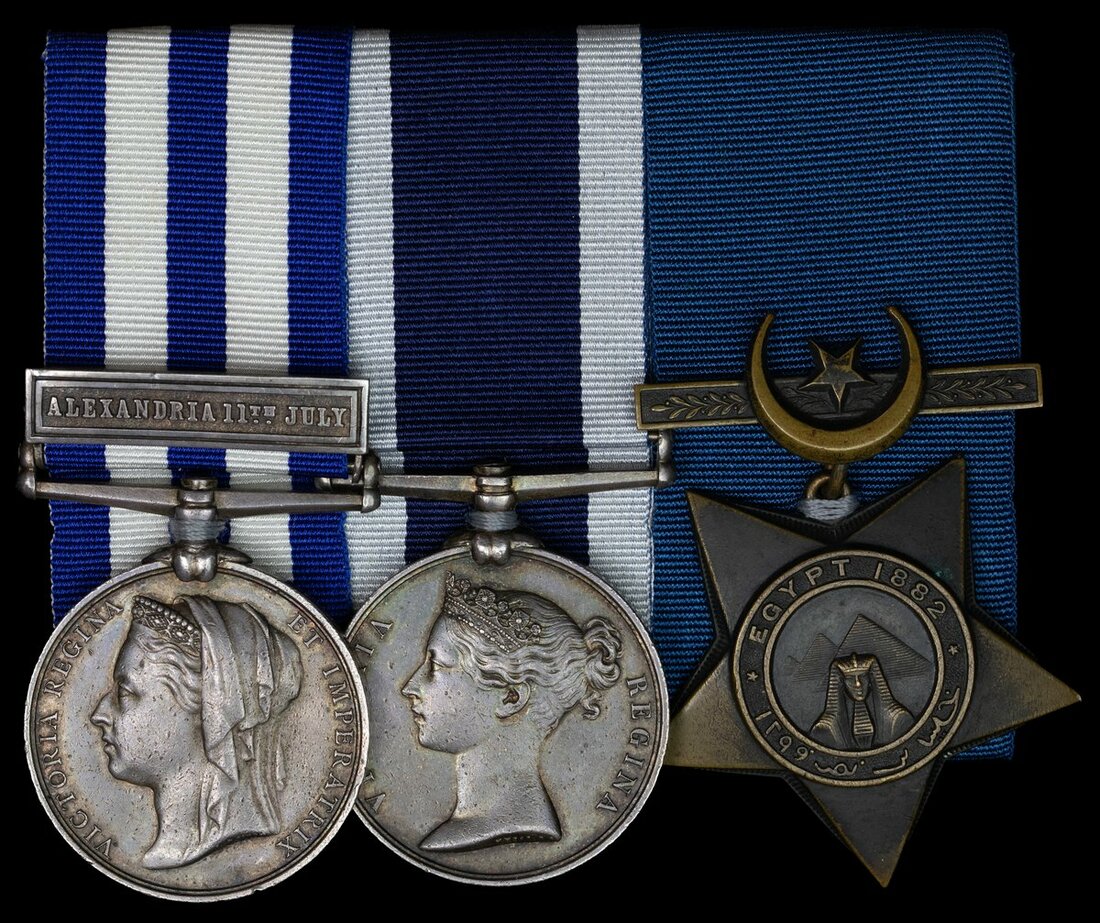 Egypt and Sudan 1882-89, dated reverse, 1 clasp, Alexandria 11th July (W. Fleetwood. Cpl. R.M.A. H.M.S. "Alexandra."); Royal Navy L.S. & G.C., V.R. (Wm. Fleetwood, Corpl. L. Co. R.M.A.); Khedive's Star, dated 1882, mounted court style for wear, minor contact marks, overall very fine (3)