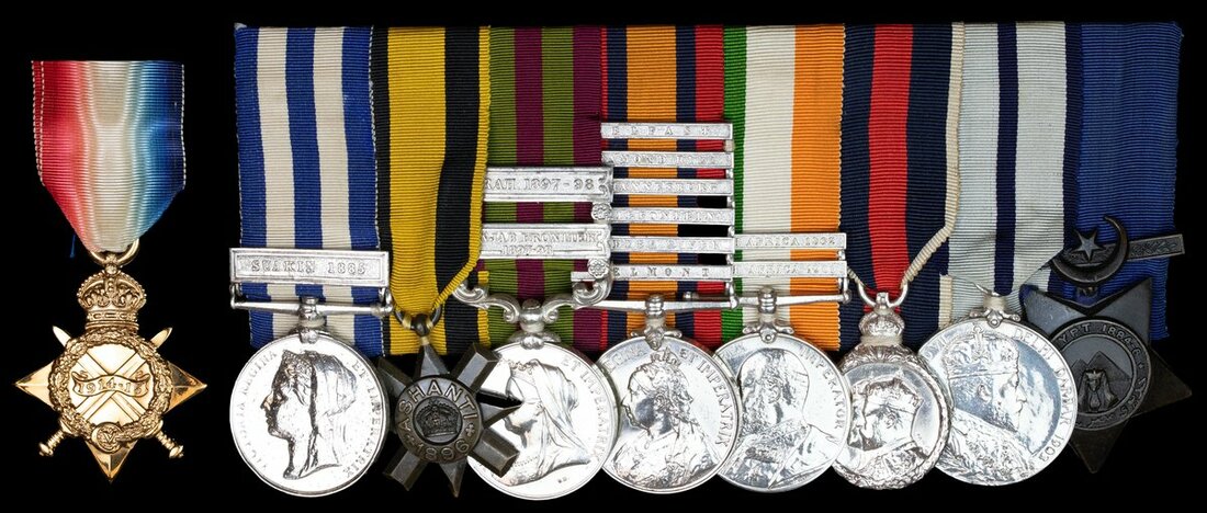 Egypt and Sudan 1882-89, undated reverse, 1 clasp, Suakin 1885 (Surgn W. C. Beevor. M.B. 5.1. Scott. Div. R.A.); Ashanti Star 1896, unnamed as issued; India General Service 1895-1908, 2 clasps, Punjab Frontier 1897-98, Tirah 1897-98 (Surgn: Major W. C. Beevor. A.M.S.); Queen's South Africa 1899-1902, 6 clasps, Belmont, Modder River, Driefontein, Johannesburg, Diamond Hill, Belfast (Major W. C. Beevor., M.B., C.M.G. R.A.M.C.); King's South Africa 1901-1902, 2 clasps, South Africa 1901, South Africa 1902 (Surg:Major: W. C. Beevor, M.B., C.M.G., ScotsGds:); Coronation 1902; Delhi Durbar 1903, unnamed as issued; Khedive's Star, dated 1884-6; 1914-15 Star (Col. W. C. Beevor A.M.S.), the last unmounted, the rest mounted court-style as worn, clasp back-straps adapted to facilitate mounting, contact wear overall, very fine (9)