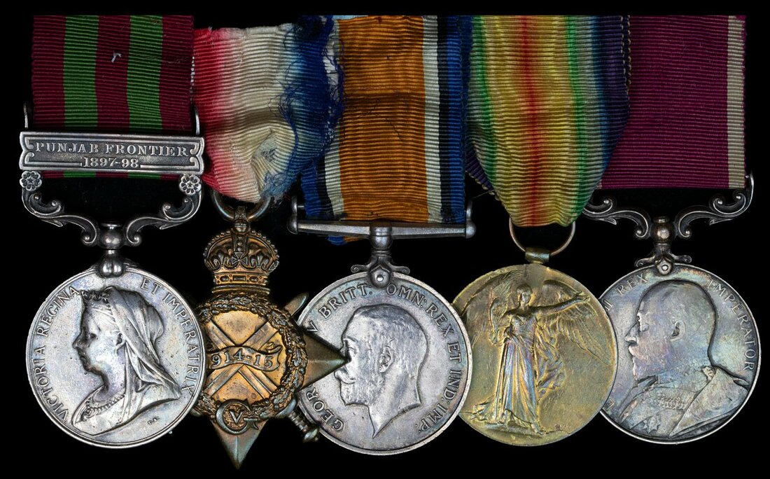 India General Service 1895-1908, 1 clasp, Punjab Frontier 1897-98 (3276 Pte [...] Bryan. 1st Bn. Som. Lt. Infy.); 1914-15 Star (13668 Pte. W. Bryan. R. Fus.); British War and Victory Medals (13668 Cpl. W. Bryan. R. Fus.); Army L.S. & G.C., E.VII.R. (3276 Bglr. W. Bryan. Somerset. L. I.), the suspension of the first slack, pitting, edge wear and contact marks, very fine (5)