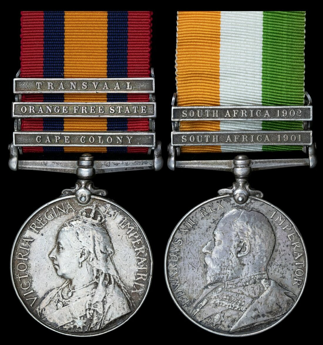 Queen's South Africa 1899-1902, 3 clasps, Cape Colony, Orange Free State, Transvaal (5035 Dmr: T. Mitchell, 2: RL: Berks: Regt); King's South Africa 1901-02, 2 clasps, South Africa 1901, South Africa 1902 (5035 Dmr: T. Mitchell. RL.: Berks: Regt), both with slightly loose suspensions, contact marks and edge bruising otherwise good fine possibly better (2)