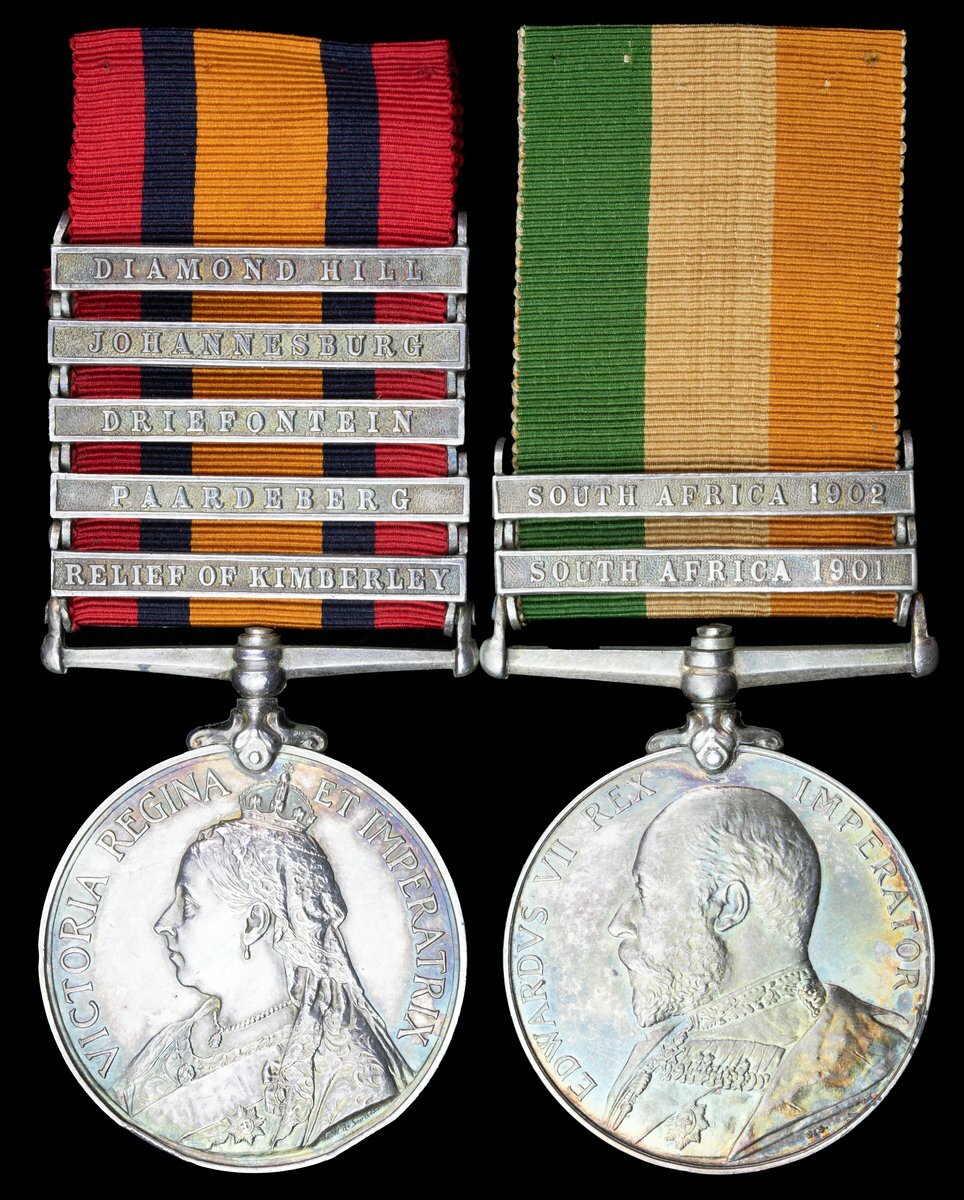 Queen's South Africa 1899-1902, 5 clasps, Relief of Kimberley, Paardeberg, Driefontein, Johannesburg, Diamond Hill (3508 Corpl: G. Snelling. Essex Regt), two edge bruises, otherwise very fine; King's South Africa 1901-1902, 2 clasps, South Africa 1901, South Africa 1902 (3058 Corpl: G. Snelling. Essex Regt), some scratchings to edge but otherwise very fine (2)