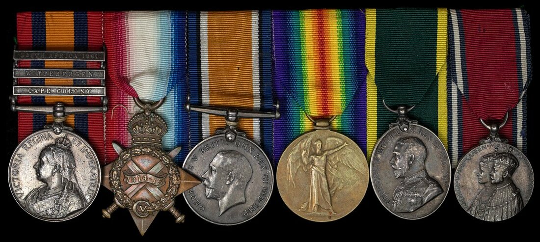 Thomas W. Tansley was born was Salford, Woburn, Bedfordshire and was originally a farm labourer. He attested into the Bedfordshire Regiment on 4 August 1885 and served at Home between 4 May 1885 - 26 April 1900. He served in South Africa between 27 April 1900 - 29 December 1901, before then serving back Home between 30 December 1901 - 3 May 1902 when he was discharged by then with the rank of Sergeant. Tansley served with the 1st Volunteer Battalion of the Nottinghamshire and Derbyshire Regiment between 17 March 1904 - 31 March 1908 before he attested into the 5th Battalion on 1 April 1908. He served at Home between 1 April 1908 - 28 February 1915 and served in France between 1 March 1915 - 26 August 1915 before serving back at Home between 27 August 1915 - 11 June 1919 when he was discharged then as Regimental Sergeant Major. He is further entitled to a Silver War Badge (270721) but not confirmed on the roll for the 1935 Jubilee medal.