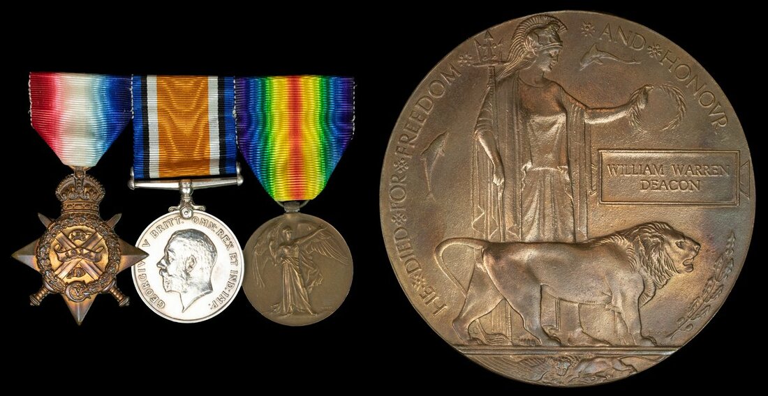 Deacon was buried in the Houchin British Cemetery, Pas de Calais, France, sold together with copied service papers and other research as well as original research comprising a telegram requesting his attendance at Buckingham Palace, three postcards, including one of Lieutenant H. N. Roberts, 10th Battalion King's Own Regiment, sent to Deacon (Roberts was killed in action the following month at Arras), a cap badge and two pips.