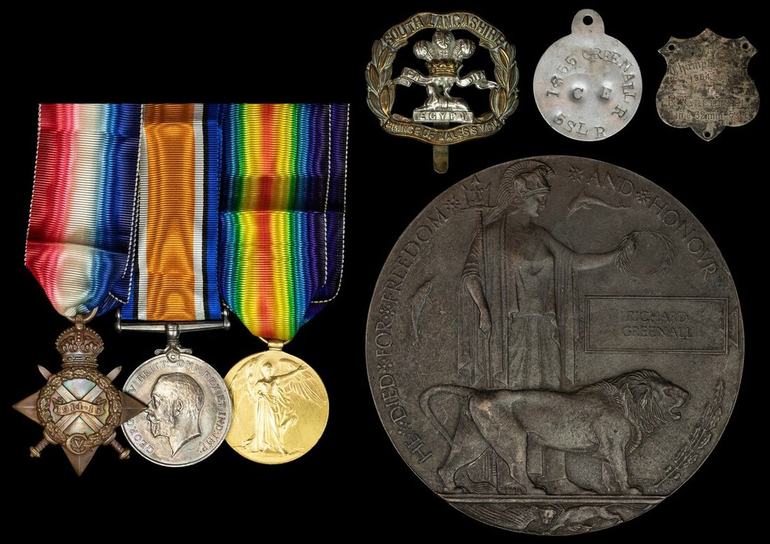 1914-15 Star (1844 Pte. R. Greenall. S.Lan:R.); British War and Victory Medals (1855 Pte. R. Greenall. S.Lan.R.); Great War Bronze Memorial Plaque (Richard Greenall), sold together with an identity tag, cap badge and the plaque from a sporting trophy named to the recipient, good very fine (4)