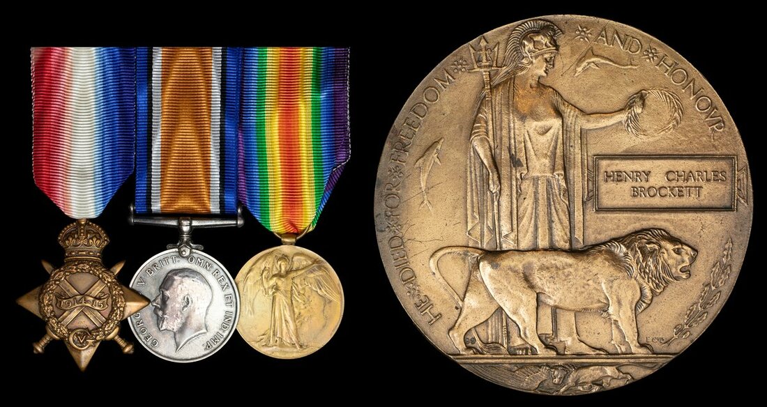 1914-15 Star (4148, Pte. H. C. Brockett, 23-Lond. R.); British War and Victory Medals (4148 Pte. H. C. Brockett. 23-Lond. R.); Great War Bronze Memorial Plaque (Henry Charles Brockett), very fine (4)