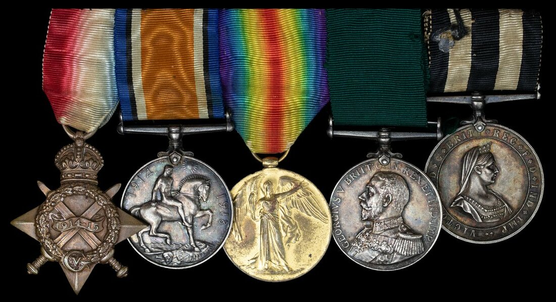 1914-15 Star (M.9308. A. E. Wingroye, R. Wdmr., R.N.); British War and Victory Medals (M.9308 A. E. Wingrove. R. Wdmr. R.N.); Royal Navy Auxiliary Sick Berth Reserve L.S. & G.C., G.V.R. (41. A. E. Wingrove, Res: Wardmaster R.N.A.S.B.R.); Service Medal of the Order of St. John (401. Amb Offr H. E. Wingrove. No 5 Dis. Sutton-In-Coldfield. S.J.A.B. 1918.), mounted on a cloth strip for display, note incorrect spelling of surname to the first, otherwise very fine (5)