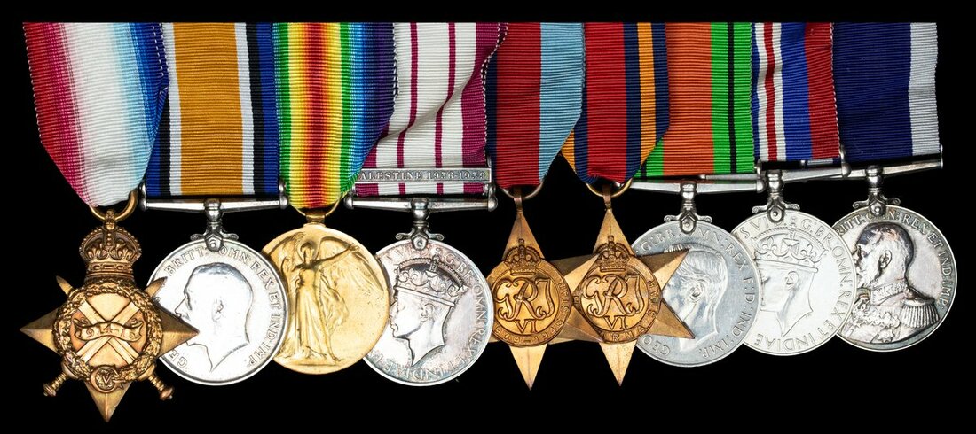 1914-15 Star (J.28012. R. W. Elphick. A.B., R.N.); British War and Victory Medals (J.28012 R. W. Elphick. L.S. R.N.); Naval General Service 1915-62, 1 clasp, Palestine 1936-1939 (J.28012. R. W. Elphick. C.P.O. R.N.); 1939-1945 Star; Burma Star; Defence and War Medals 1939-45; Royal Navy L.S. & G.C., G.V.R. (J.28012 R. W. Elphick PO HMS Dolphin), the Trio and L.S. & G.C. polished otherwise very fine (9)