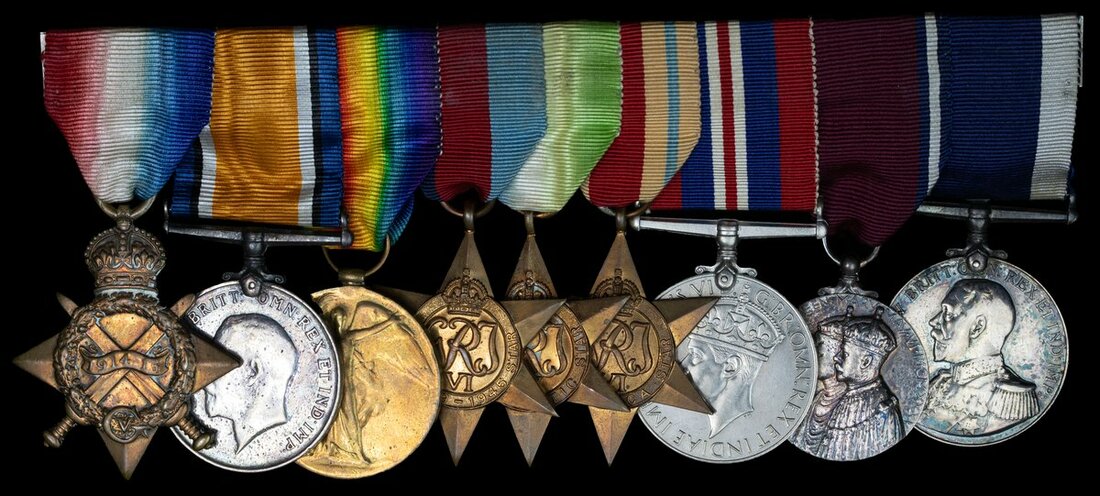 1914-15 Star (K.23815, C. W. Redwood, Sto.1, R.N.); British War Medal 1914-20 ([...] W. Redwood. Act. L. Sto. R. [...]); Victory Medal 1914-1919 (K.23815 C. W. Redwood. Act. L. Sto. R.N.); 1939-45 Star; Atlantic Star; Africa Star; War Medal 1939-45; Jubilee 1935; Royal Navy L.S. & G.C., G.V.R. (K.23815, C. W. Redwood. S.P.O. H.M.S. Dolphin.), mounted as worn, the Great War awards and L.S. & G.C. polished with heavy contact wear, overall very fine (9)