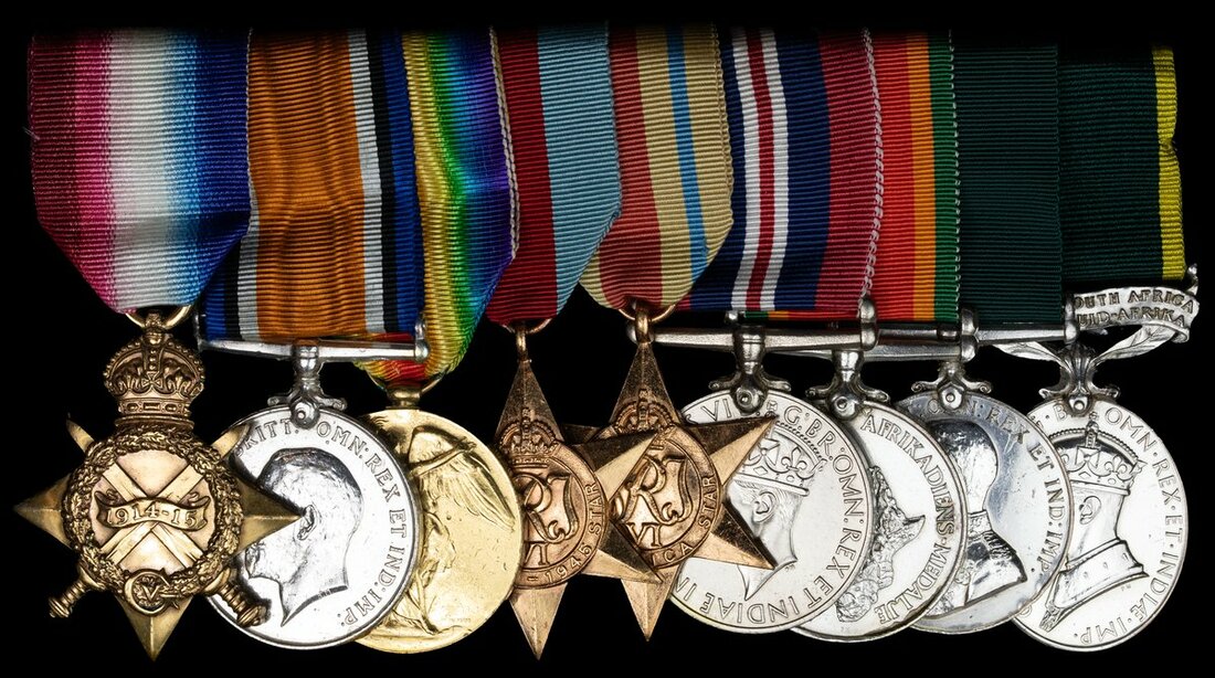 1914-15 Star (Pte. E. L. Oates 1st M.R.); British War and bi-lingual Victory Medals (Pte. E. L. Oates. 4th S.A.H.); 1939-45 Star; Africa Star; War Medal 1939-45; Africa Service Medal 1939-45, all officially impressed (4266 E. L. Oates); Colonial Auxiliary L.S. & G.C., G.V.R. (No. 37126 Sjt. E. L. Oates. 1st Natal Carbs); Efficiency Medal, Union of South Africa, G.VI.R. (No. 4266 S/Sgt. E. L. Oates N.M.C.), mounted as worn, minor pitting, very fine (9)