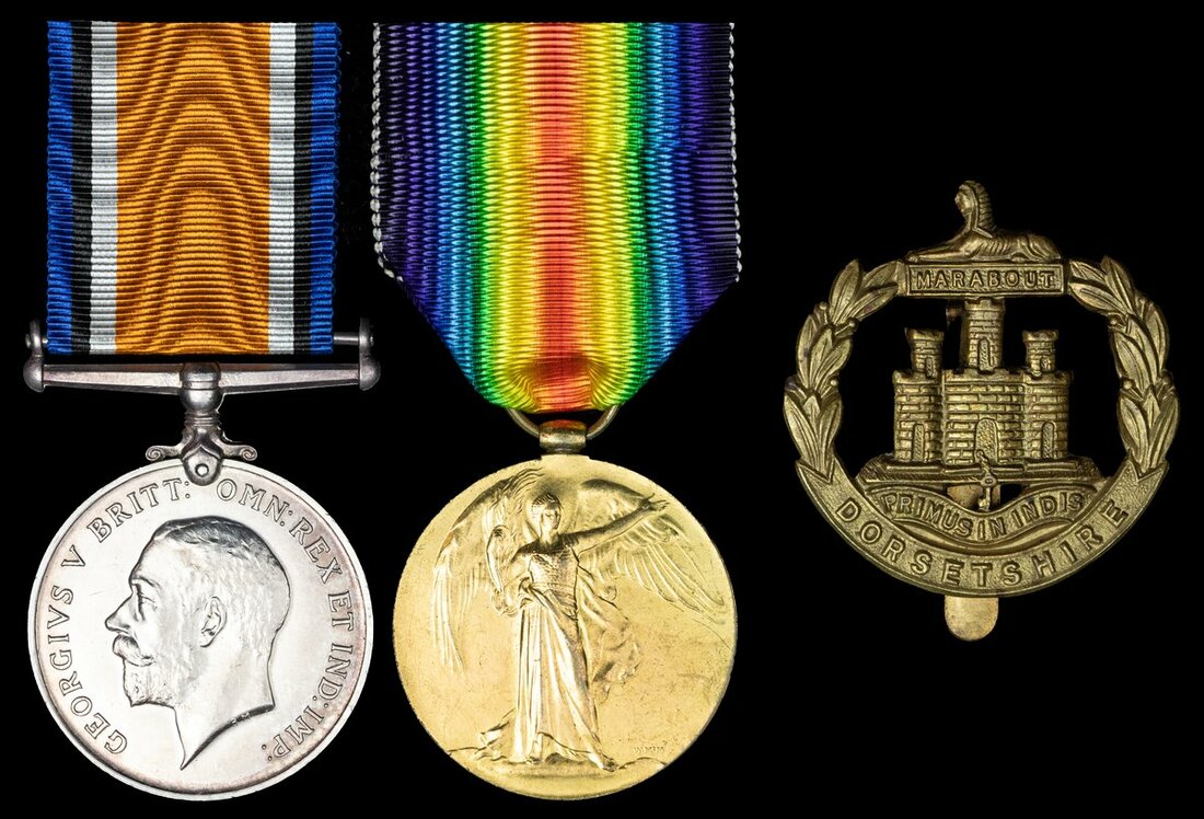 British War and Victory Medals (40602 Pte. E. Stratfull. Dorset. R.), with a Dorset Regiment cap badge, very fine (2)