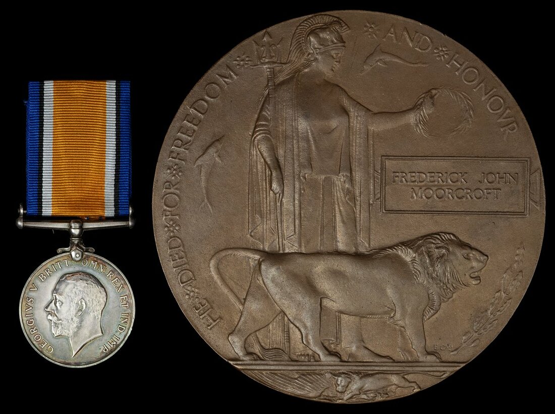 A British War Medal awarded to Air Mechanic 1st Class F. J. Moorcroft, Royal Flying Corps, who was killed in action on 3 August 1917 serving with No.42 Squadron