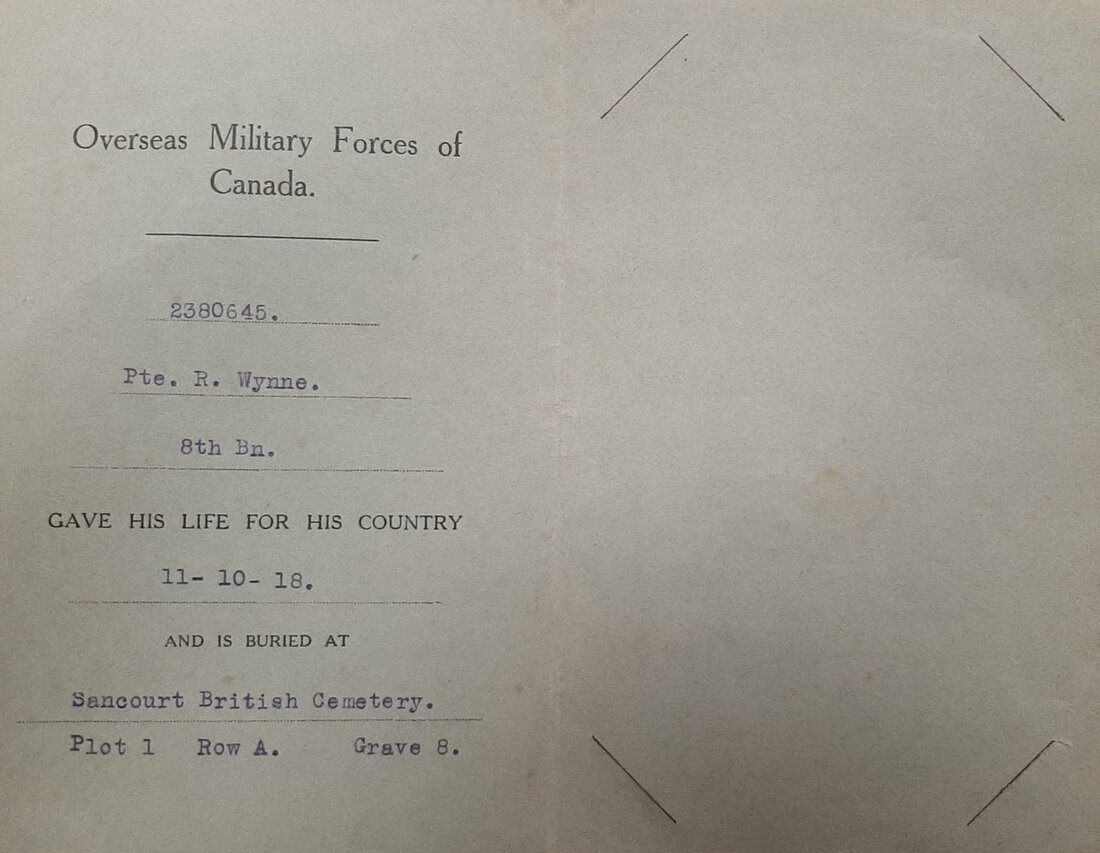 Arriving in England in April he entered the war in France on 5th September, with the 52nd Canadian Battalion but was transferred to the 8th Canadian Infantry (90th Winnipeg Rifles) on 15 September. They were involved in heavy action during the final advance of the Hundred Days and as such Wynne was killed in action before the month was out.