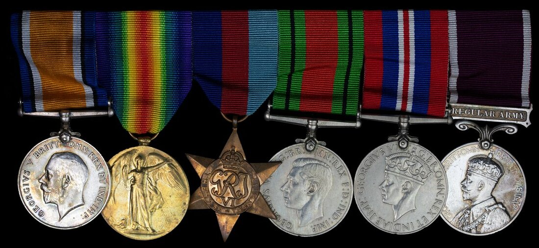 Percy Knyvett Popay was born at Altrincham, Cheshire on 9 August 1898, the son of Benjamin and Alice Popay. Enlisting when the war began Popay was posted to the 11th Battalion Suffolk Regiment and was wounded in the right arm whilst serving with them. Joining the Royal Army Service Corps postwar Popay's medals were noted as returned upon their issue with the note Black Sea, suggesting he was serving with the British Army on the Hellespont at the time. They were re-issued to him on 9 June 1926.
