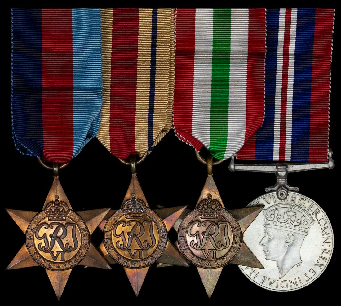 1939-45 Star; Africa Star; Italy Star; War Medal 1939-45, sold together with named medal slip of issue and named medal box of issue, good very fine (4)