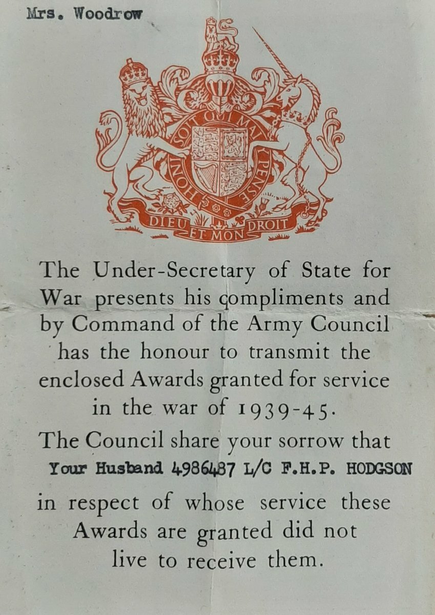 Hodgson was buried at the Anzio War Cemetery, his medals were sent to his widow Winifred Beatrice