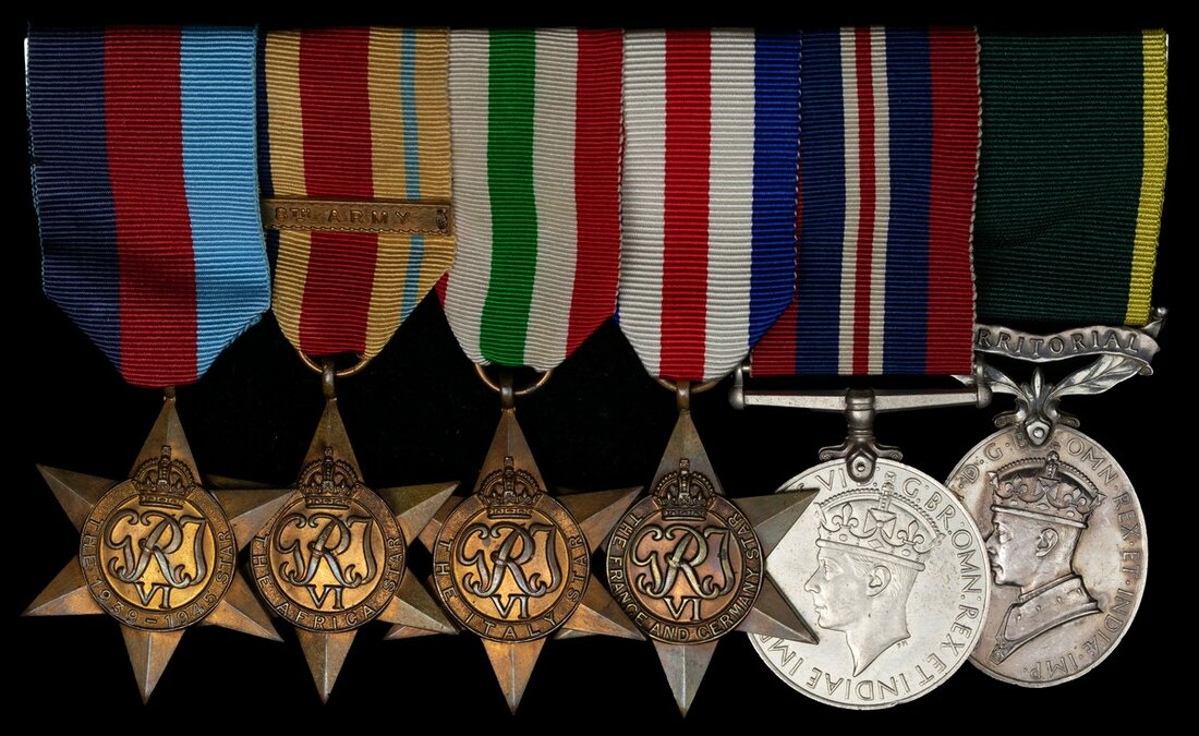 1939-45 Star; Africa Star, copy clasp, 8th Army; Italy Star; France and Germany Star; War Medal 1939-45; Efficiency Medal, G.VI.R., Territorial (7895176 Tpr. J. P. Bridgwood. Sharpshooters), mounted as worn, very fine (6)