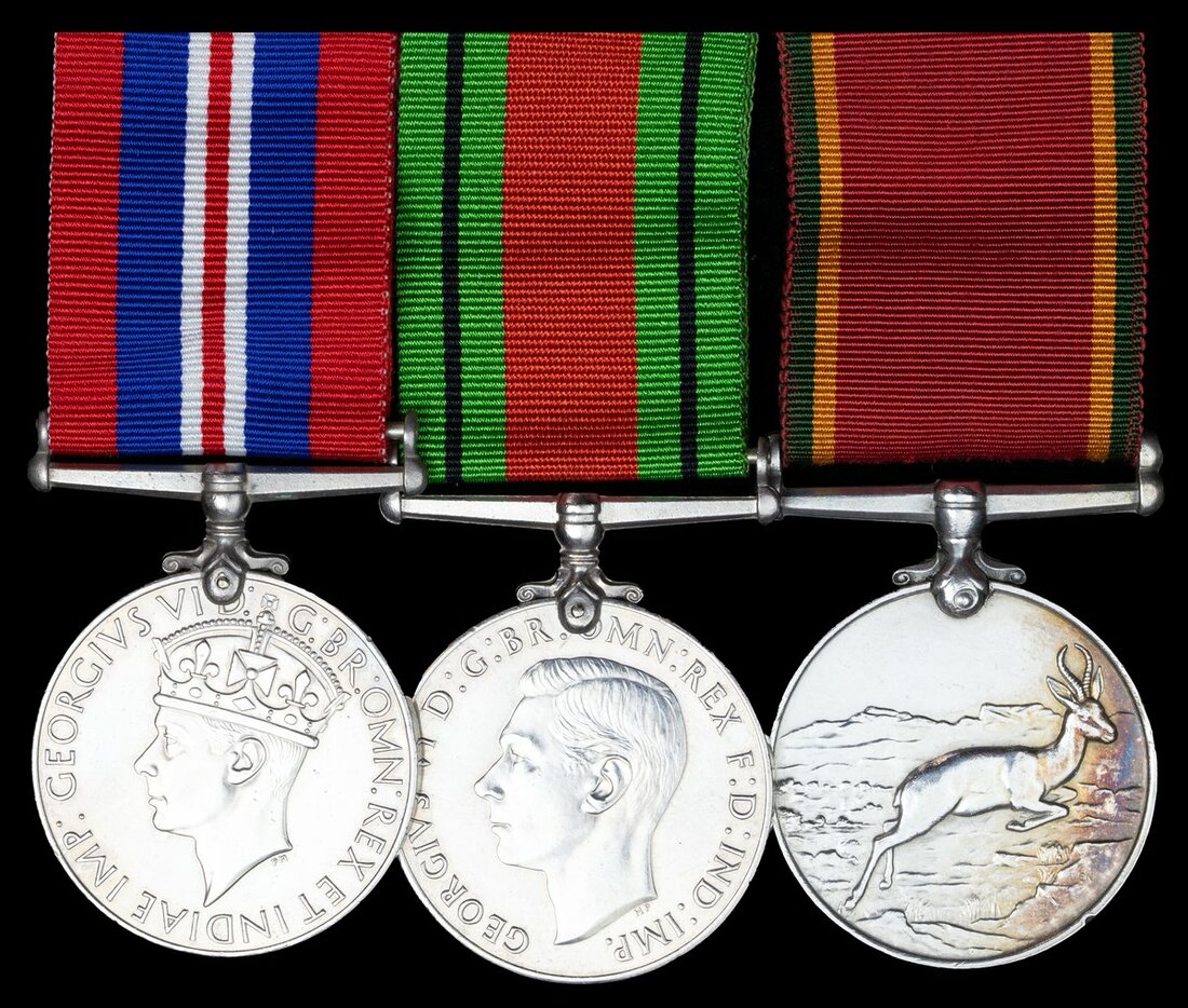 James Albert Wilks was born at Gloucester, England on 14 April 1918. He was a motor driver prior to him attesting into the Union Defence Force on 21 May 1940. He joined the "Q" Services M.T. and served in Egypt 1 October 1942 - 18 February 1944. He then served in Palestine between 19 February 1944 before serving back in Egypt until 4 July 1944. He then served at the P.O.W. Camp Weza (KwaZulu Natal) from 7 October 1944 and was finally discharged on 4 November 1948. His entitlement to the three campaign medals was confirmed on 13 March 1947 and these were sent to him in 1952. Sold with photocopied service papers.