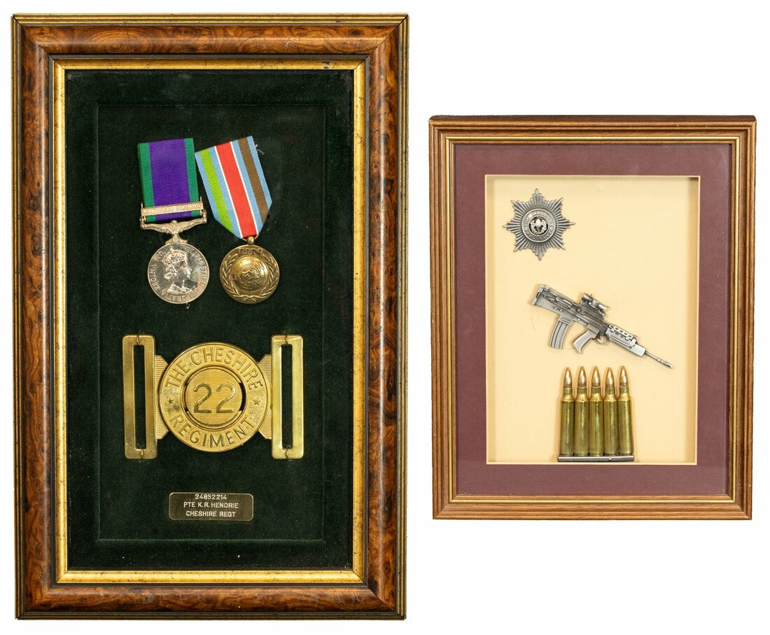 Housed in display frame with a Cheshire Regiment belt buckle, with further frame housing replica badge etc.