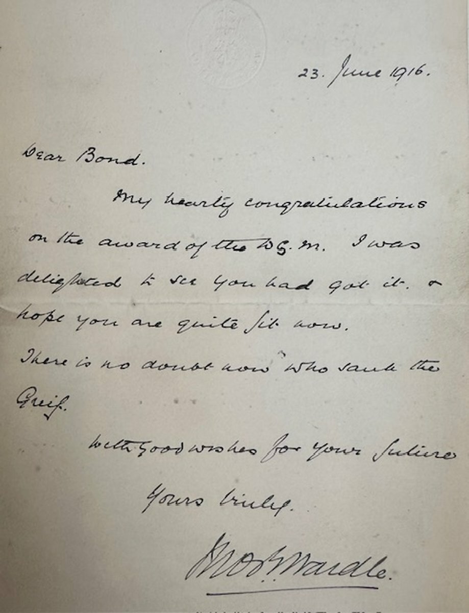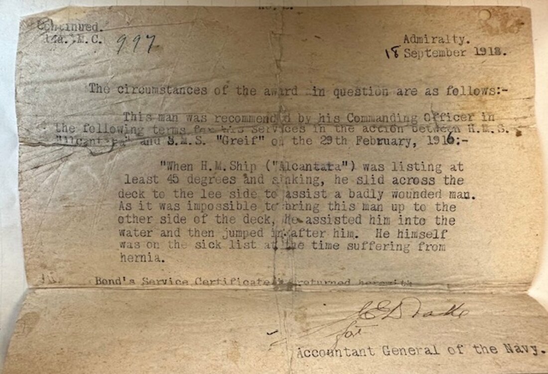 Awarded the D.S.M. for his part in rescuing a wounded shipmate, Bond next joined the rescue tug and survey ship Seahorse in Portsmouth, in which capacity he served from September 1916 until July 1919.