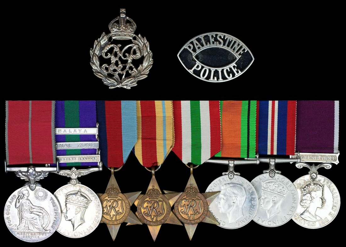 Frederick George Clark enlisted with the Royal Engineers on April 1937 but was discharged on 22 July 1938. Re-enlisting with the Royal Artillery he was attached to the Army Air Corps after the Second World War, later transferred to the Palestine Police; sold together with copied research including the GSM letter of issue confirming the recipient's entitlement along with two Palestine Police Badges and a copy of Palestine Betrayed by Robin H. Martin.