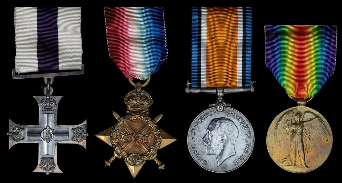 A remarkable Sniper's M.C. group of four awarded to Lieutenant A. E. S. Crosse, Special Reserve of Officers, attached 13th Battalion, Royal Fusiliers, who commanded his Battalion's snipers in battle despite having lost an eye whilst an enlisted man in 1916