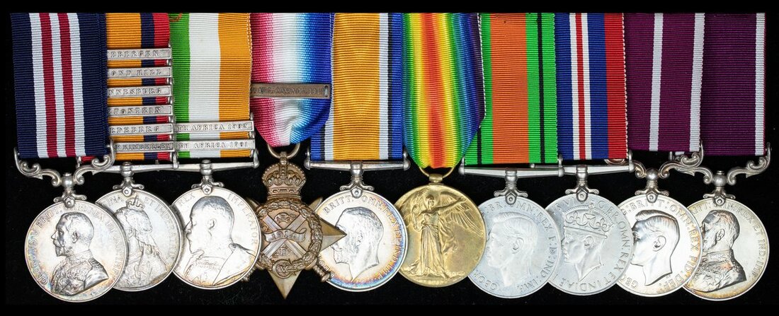 Military Medal, G.V.R. (11734 S.Sjt: A. H. D. Campion. 11/F.A. R.A.M.C.); Queen's South Africa 1899-1902, 6 clasps, Relief of Kimberley, Paardeberg, Driefontein, Johannesburg, Diamond Hill, Wittebergen (11734 Pte A. H. O. Campion, R.A.M.C.); King's South Africa 1901-02, 2 clasps, South Africa 1901, South Africa 1902 (11734 Corpl: A. H. O. Campion. R.A.M.C.); 1914 Star with clasp (11734 Sjt A. H. O. Campion. R.A.M.C.); British War and Victory Medals (11734 S.Sjt. A. Campion. R.A.M.C.); Defence and War Medals 1939-45; Army L.S. & G.C., G.V.R. (11734 S.Sjt: A. H. O. Campion. R.A.M.C.); Army Meritorious Service Medal, G.VI.R. (11734 W.O.CL.2 A. H. O. Campion. M.M. R.A.M.C.), generally very fine or better overall (10)