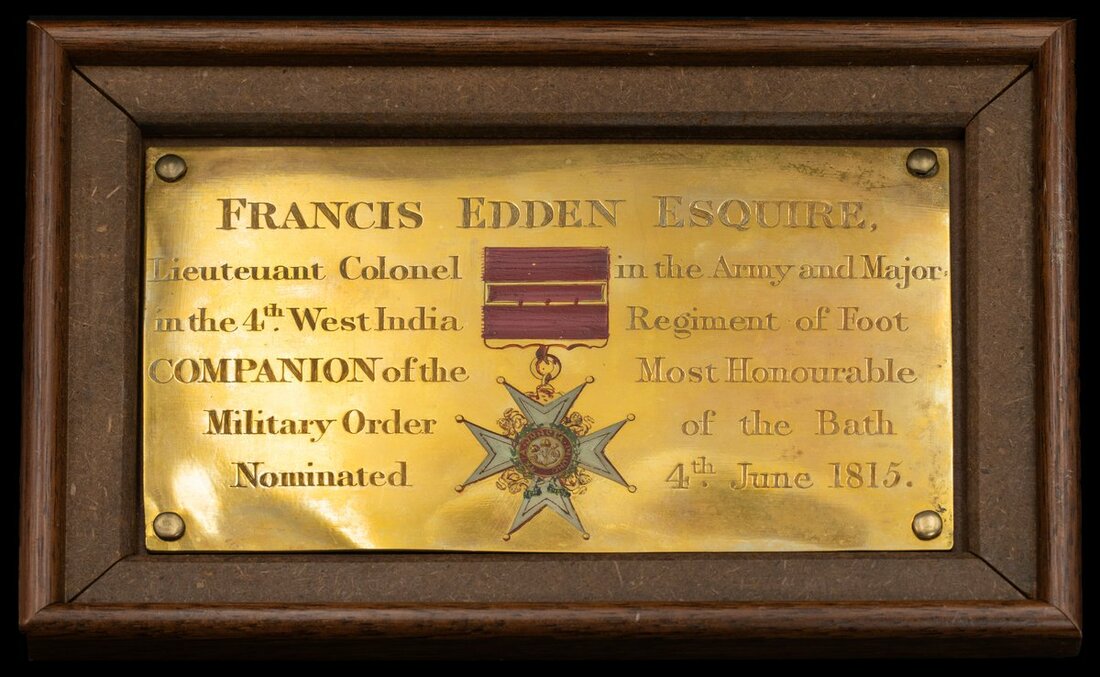 (x) The Most Honourable Order of the Bath, C.B. (Military) Companion's Chapel Stall Plate, gilded brass with engraved and painted image of a C.B. Badge, inscribed 'Francis Edden Esquire, Lieutenant Colonel in the Army and Major in the 4th West India Regiment of Foot Companion of the Most Honourable Military Order of the Bath Nominated 4th. June 1815.', 191mm x 115mm, in wooden frame, some scratches to brass but otherwise very fine