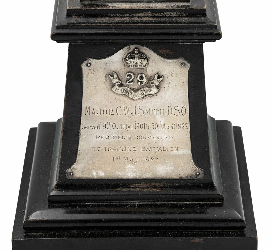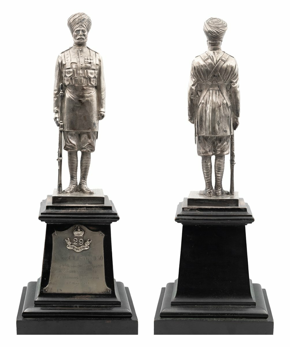 Comprising an Indian soldier standing to attention wearing a Great War other ranks combat uniform with Sergeant stripes to the right arm and wound stripes to the lower left arm, with a 'Trio' to the left breast, boots and puttees, additionally wearing 1908 Pattern webbing (part set) and holding an S.M.L.E. rifle, hallmarked 'B & F Ltd 1923, this mounted on a wooden stand to the front a silver plaque, this with applied King's crown, the numerals '29' and 'Punjabis' in riband, below this the following inscription 'Major C. W. J. Smith. D.S.O. Served 9th October 1901 to 30th April 1922 Regiment Converted to Training Battalion 1st May 1922, engraved, hallmarked B & F Ltd 1922, total height 50cm, housed in fitted wooden storage box for transportation with carrying handle and lockable door, polished in parts otherwise good overall condition