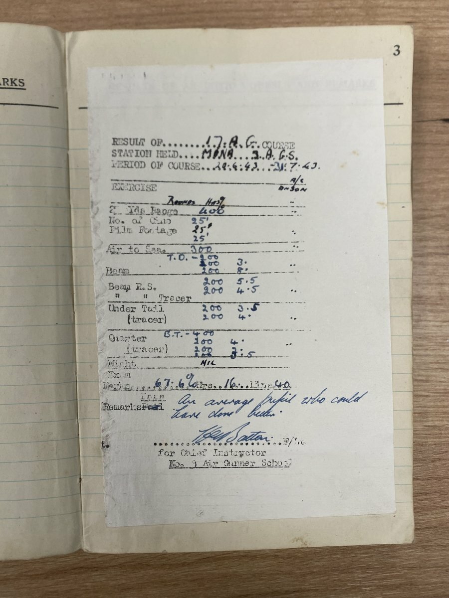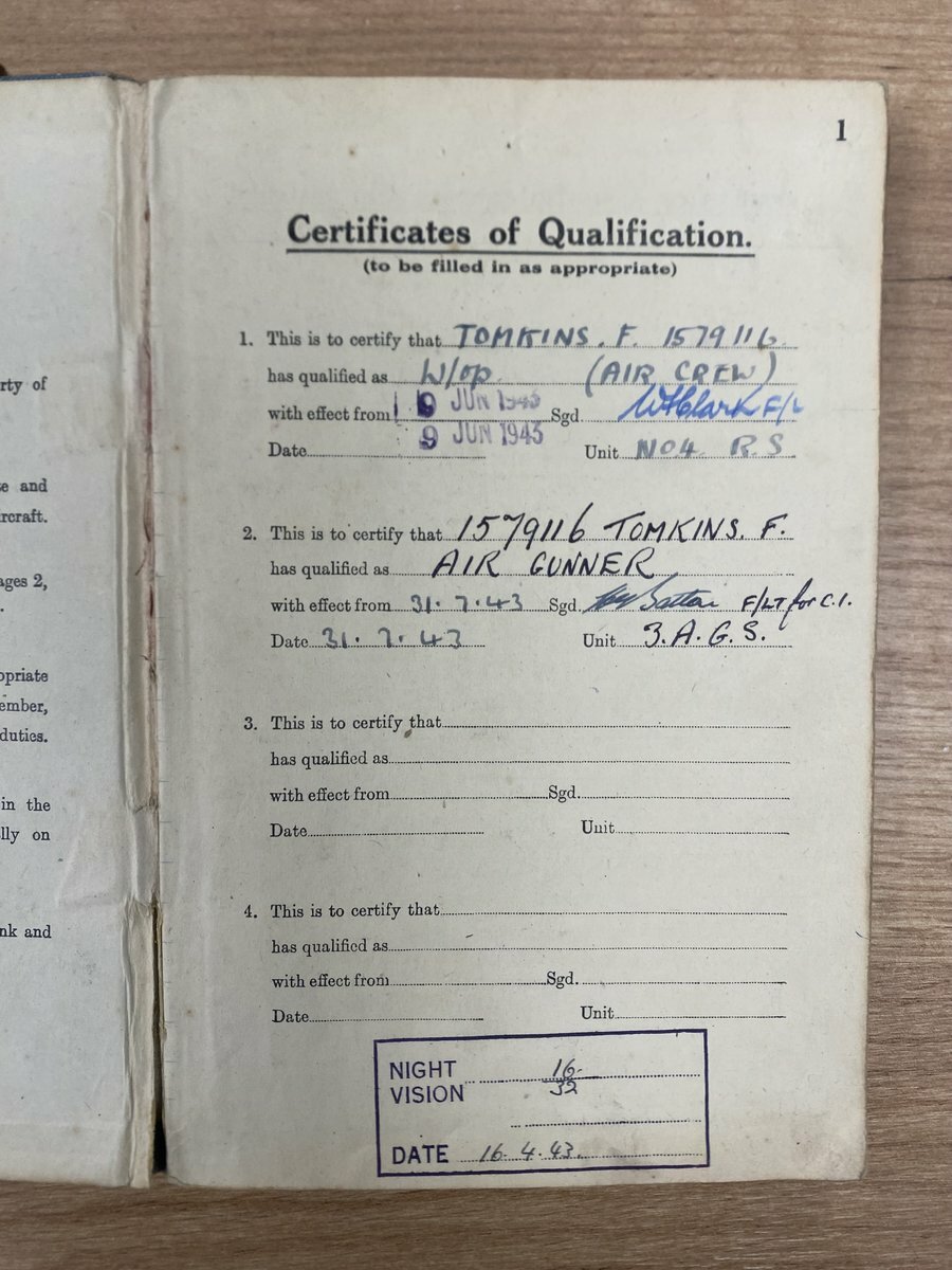 Frederick Tomkins qualified as a wireless operator (air crew) on 9 June 1943. He completed 13 hours of training before qualifying. A month later, on 31 July 1943, he qualified as an air gunner. Having done just over a month's training for this latter qualification, the Chief Instructor of No.3 Air Gunner School commented that having passed the exam with a grade of 67%, and having completed 16 hours of training, Tomkins was "an average pupil who could have done better". Needless to say, Tomkins went on to greatly prove him wrong.