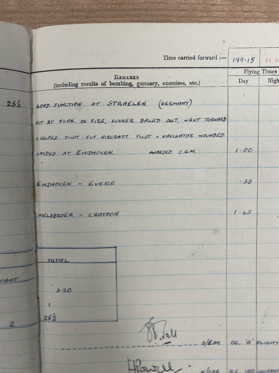 Tomkins himself noted the incident in his Log Book which reads: 'Road junction at Straelen (Germany) Hit by flak. On fire, gunner baled out, went forward + helped pilot fly aircraft. Pilot + navigator wounded Landed at Eindhoven. Awarded C.G.M.'. He continued to serve with Flight Lieutenant Bruce from 14 January 1945 to the end of his Second World War service on 4 March 1945. He amounted 214 day hours and 11 night hours of flying time.