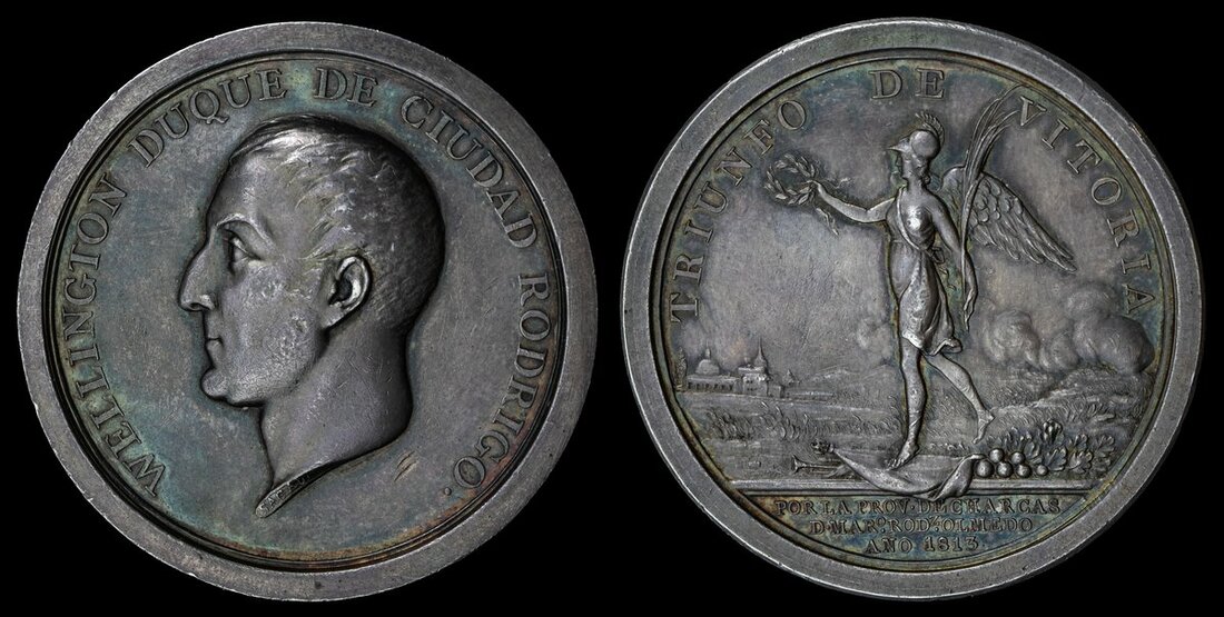 Arthur Wellesley, 1st Duke of Wellington, Silver Medal for the Battle of Vittoria, by Sagau, silver, 46mm, obv. portrait of left-facing Wellington, inscribed 'WELLINGTON DUQUE DE CIUDAD RODRIGO', rev. winged Victory and inscribed 'TRIUNFO DE VITORIA, POR LA PROV. DE CHARCAS D. MARo. RODz. OLMEDO ANO 1813.', good very fine
