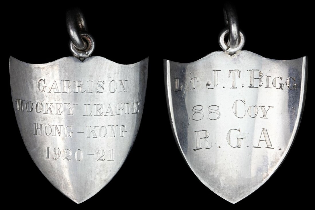 Hong Kong Garrison sports medal, shield with ring for wear engraved 'Garrison Hockey League Hong-Kong 1920-21 L/t J. T. Bigg. 88 Coy. R.G.A.', very fine