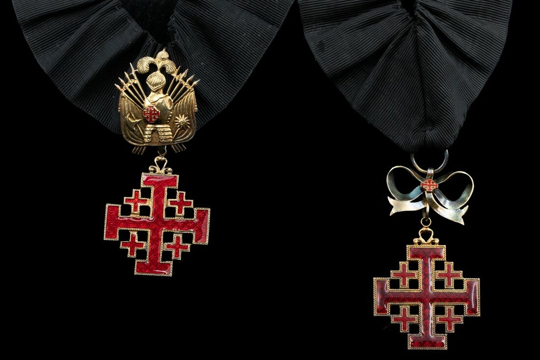 Vatican, Holy See, Order of the Holy Sepulchre, neck Badge (2), both by G. Guiccione, Rome, one with trophy of arms suspension, one with bow suspension, good very fine, in fitted cases of issue with neck ribands as worn (2)
