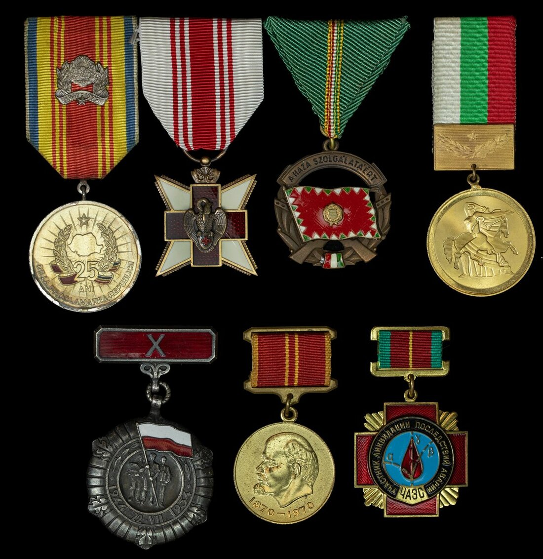 Belgium, Kingdom, Red Cross Blood Donor's Medal, bronze and enamel; Bulgaria, Republic, '1300th Anniversary of Bulgaria' Medal; Hungary, Republic, Services to the Homeland, Third Class; Poland, USSR, Medal of the 10th Anniversary of People's Poland; Romania, USSR, Medal for the 25th Anniversary of the Proclamation of the Republic; Russia, Soviet Union, Jubilee Medal 'In Commemoration of the 100th Anniversary of the Birth of Vladimir Ilyich Lenin', obverse 'For Military Valour', brass; Ukraine, USSR, Chernobyl Liquidators' Medal, very fine (7)