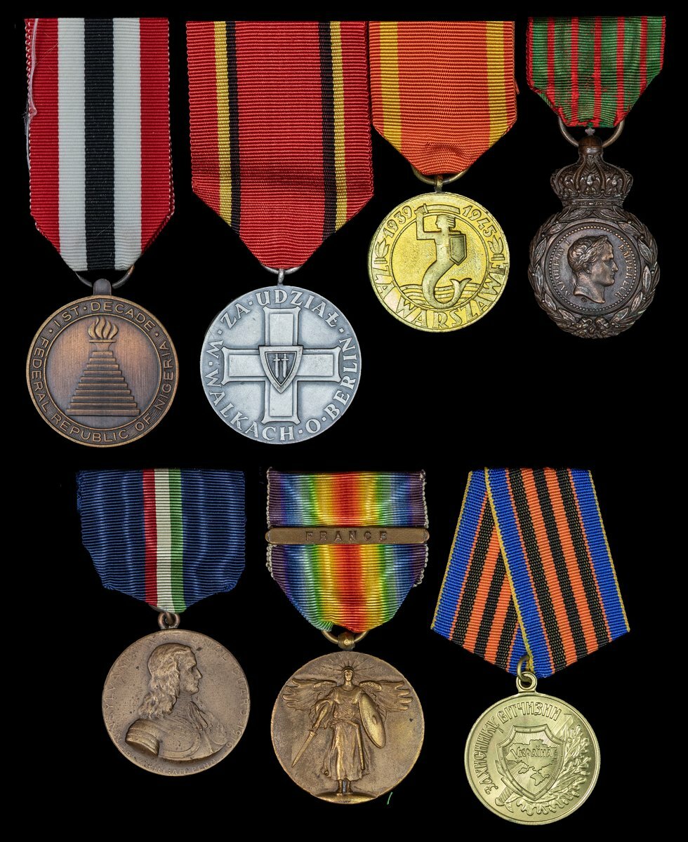 World Medals: France, St. Helena Medal 1857; Nigeria, 10th Anniversary of the Republic 1973; Poland, 1939-1945 Medal for Warsaw; Medal for Participation in the Battle of Berlin; Ukraine, Defender of the Motherland, with booklet; United States of America, Bronze Star very fine; Purple Heart (3), two in cases of issue, very fine one with personalised message; Victory Medal 1914-18, 1 clasp, France; Air Medal (Paul J. Peoples); Vietnam Service Medal; National Defense Medal Achievement Medal, Navy and Marine in case of issue; Pennsylvania National Guard Mexican Border Service 1916, very fine overall (15)