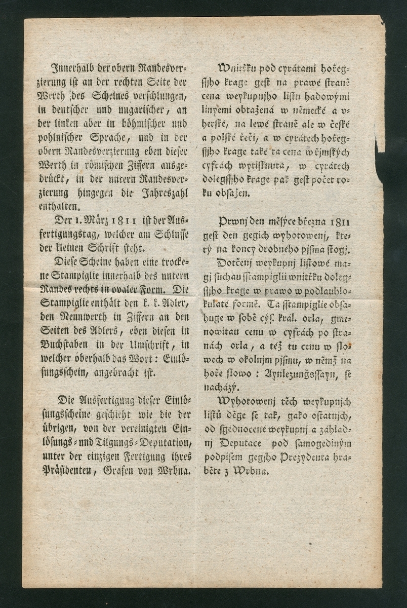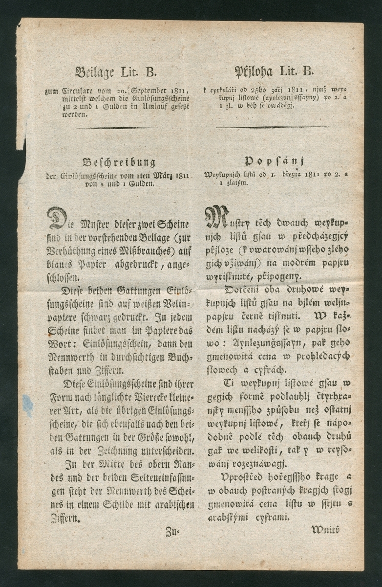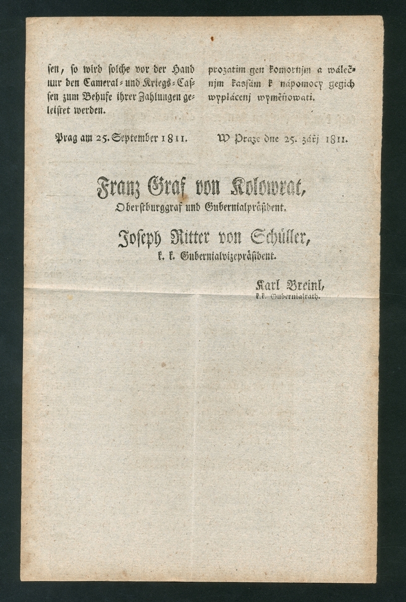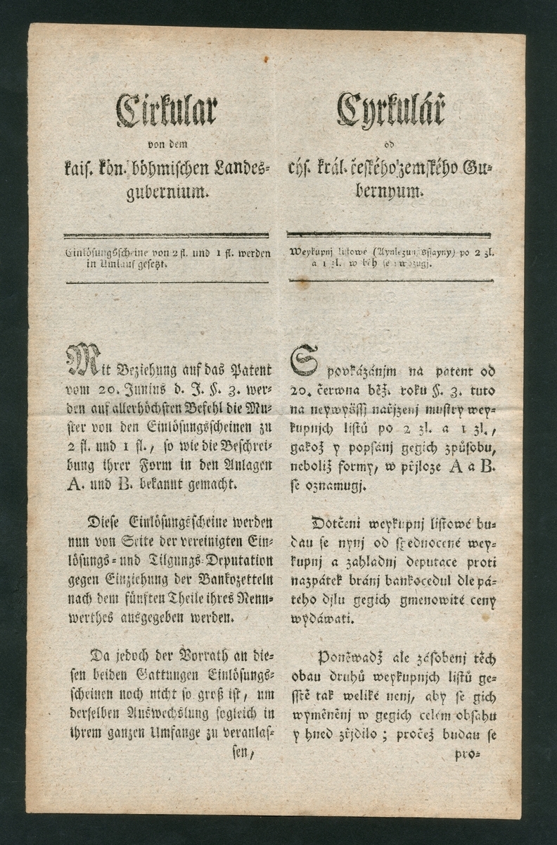 announcement relating to the new 1811 issue of coupons for 1 & 2 gulden, in facing columns of German and Czech, 25th September 1811, Prague (4 pages),