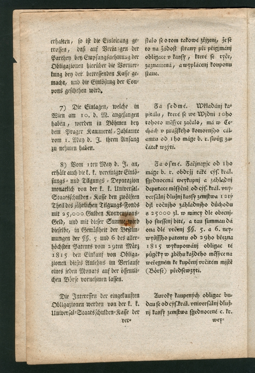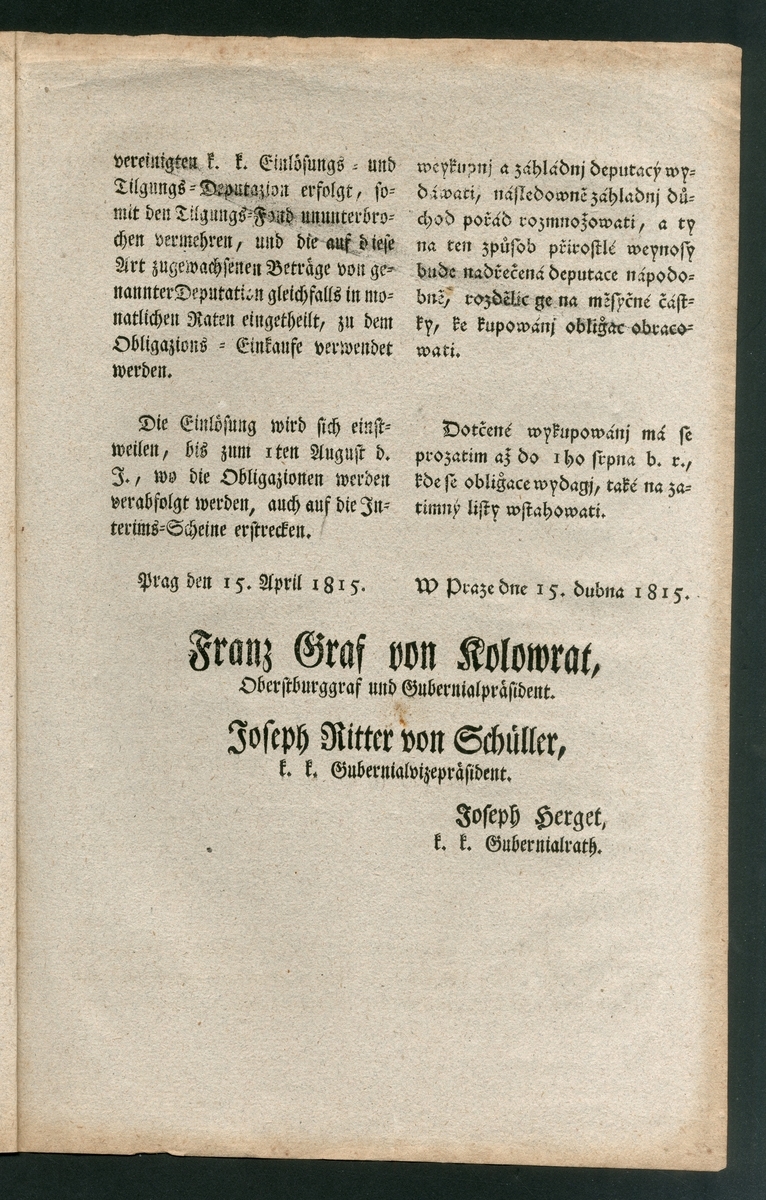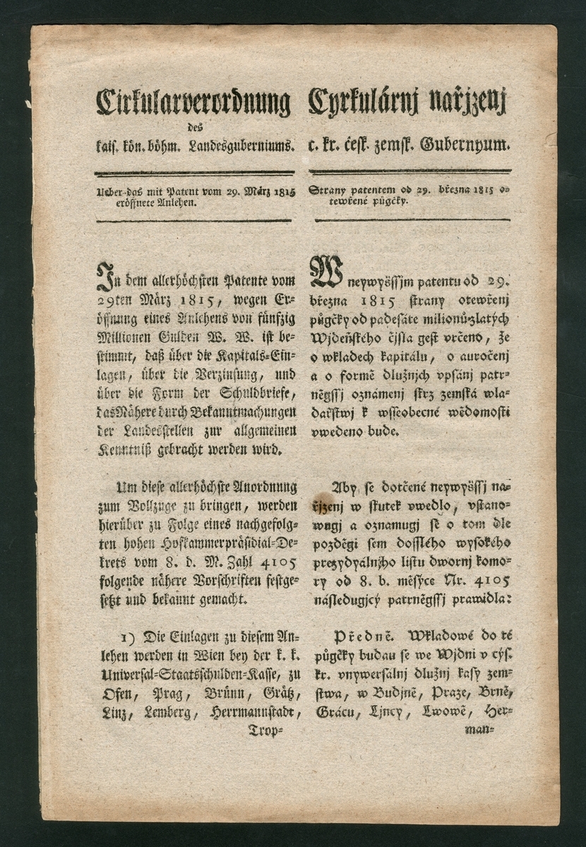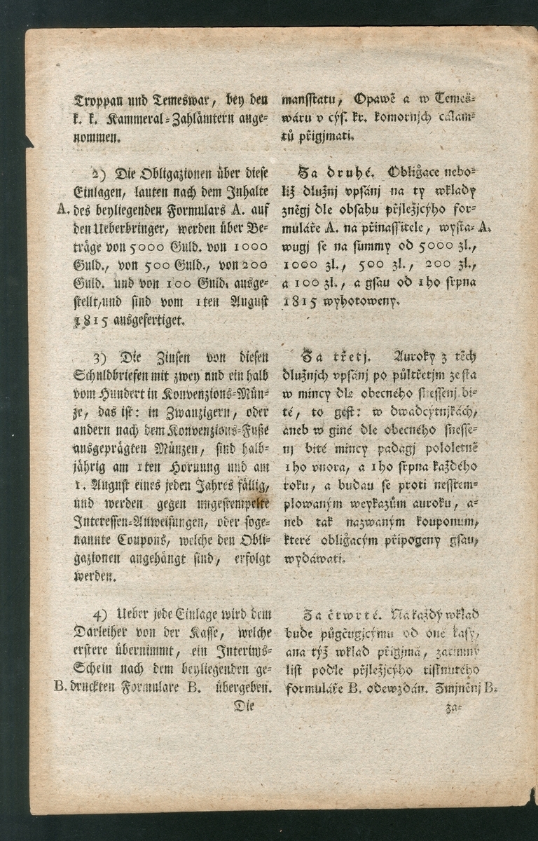 announcement relating to the new 1811 issue of coupons for 1 & 2 gulden, in facing columns of German and Czech, 25th September 1811, Prague (4 pages),