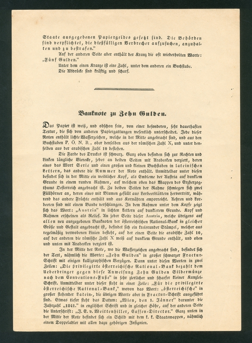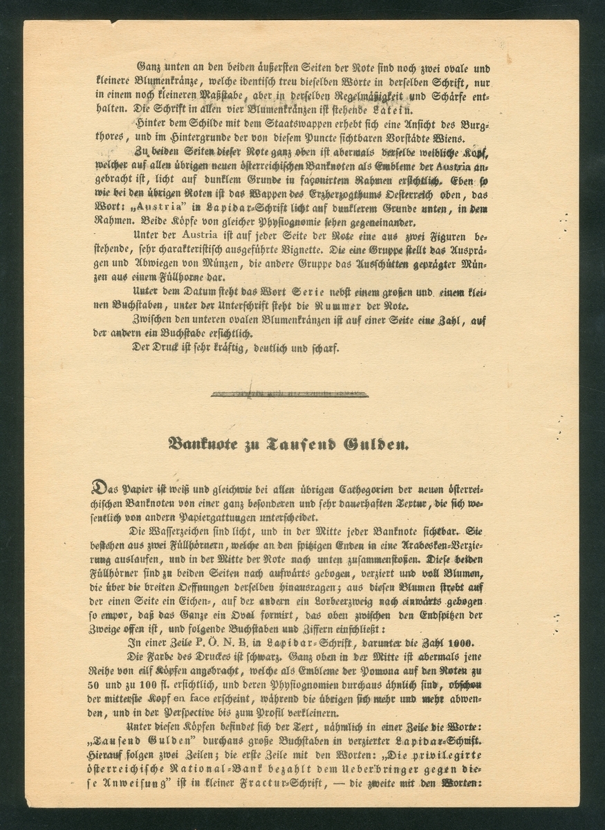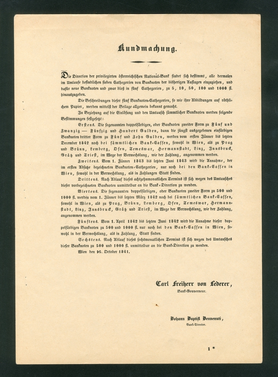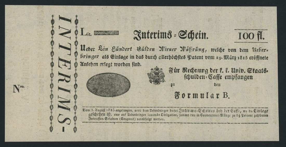announcement relating to the new 1815 issue of 100, 200, 500, 1000 & 50000 Gulden interim notes, in facing columns of German and Czech, 15th April 1815, Prague (5 pages), together with a sample interim 100 gulden note,